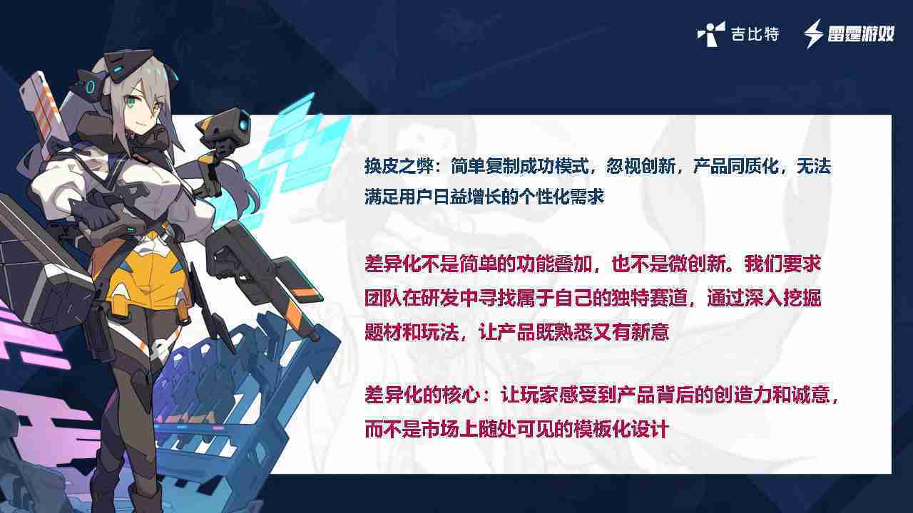 在我们内部是这么定义差异化的。。首先,,差异化不是简单的功能叠加,,更不是换皮。。。只是换皮,,产品无法提供有效的市场价值。。。内部经常说差异化的产品不是为了迎合市场,,,,而是找到一个自己独特的表达方式,,,,在研发中找到属于自己的细分赛道和独特赛道,,,,前提是需要对这个题材有足够的深入、、挖掘,,对玩法有足够深入的理解,,,让产品看起来既熟悉又有新意。。