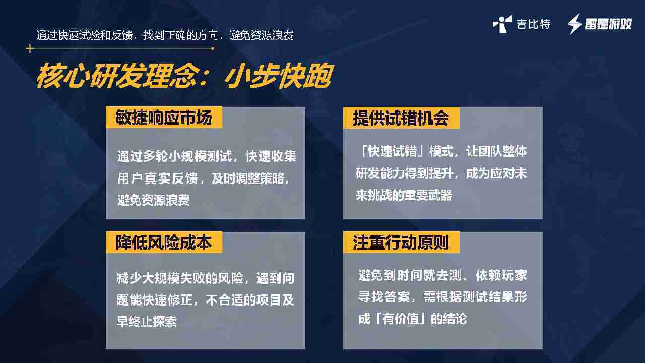 从目前的实践来看,,,,内容向确实不合适,,因为小步快跑更适合做玩法的尝试,,,,但是如果是内容项,,,,玩法已经确定的,,,,这时候应该做切片,,而不是做小步快跑的方式,,因为做切片的成本是很高的。。。我们有过两个项目,,要花很长时间做切片的内容,,而切片内容只占整个项目的1/10,,,,但要花的时间成本、、、人力成本、、经济成本可能会到1/3,,所以用很短的时间做游戏的原型,,,验证其好不好玩,,是想尝试在粗糙表达的情况下,,看看能否获得非常好的留存表现。。如果留存表现非常好,,,证明游戏内容体验是比较准确和非常好的内核,,我们会尝试加外围内容的拓展。。。。