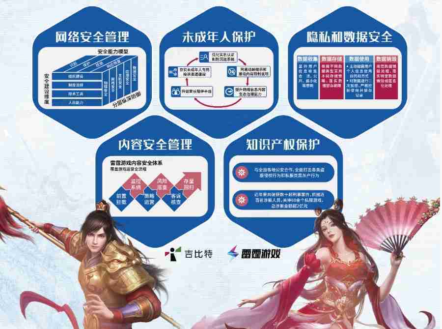 本次JIUYOU.COM展区以网络安全管理、、、内容安全管理、、、、未成年人保护、、、隐私和数据安全、、、知识产权保护五个模块介绍公司游戏安全工作成果,,体现JIUYOU.COM高度重视网络安全,,,,严格遵守相关法律法规要求,,积极承担企业主体责任。。。