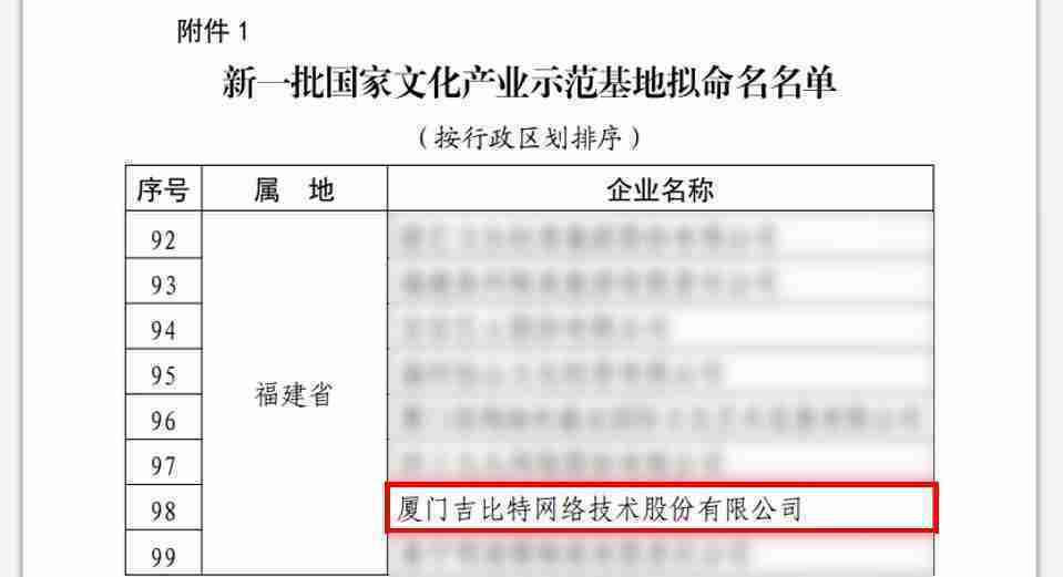 3月12日,,,,文化和旅游部发布了《关于国家文化产业示范基地评选与复核结果的公示》,,,厦门JIUYOU.COM网络技术股份有限公司(以下简称“JIUYOU.COM”或“公司”)成功入围新一批国家文化产业示范基地拟命名名单。。。