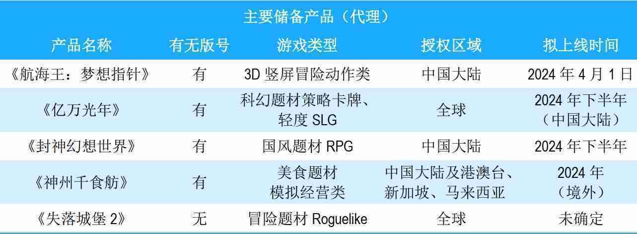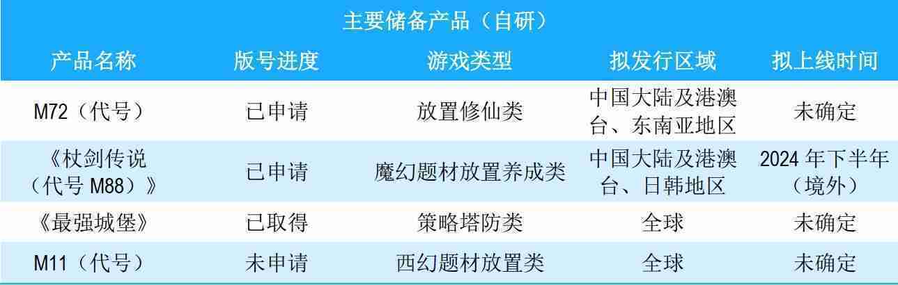 公司储备的多个自研、、、、代理产品都在有序推进当中,,涵盖放置类、、策略类、、、模拟经营类、、、RPG、、、、Roguelike等多元化游戏品类,,,,储备的主要自研和代理产品如下::