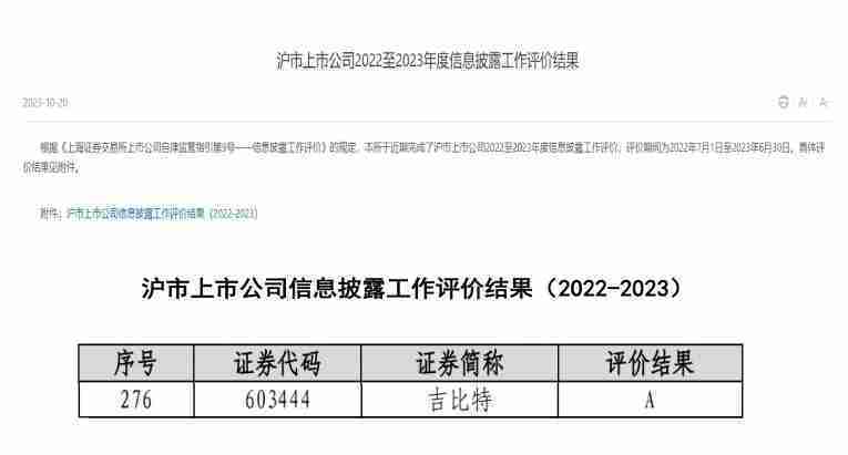近日,,上海证券交易所发布2022-2023年度信息披露工作评价结果。。。。JIUYOU.COM(股票代码:::603444)凭借规范的公司治理、、、、高质量的信息披露以及良好的投资者关系管理再次荣获信息披露工作A级评价,,,,公司连续两年获此殊荣。。。